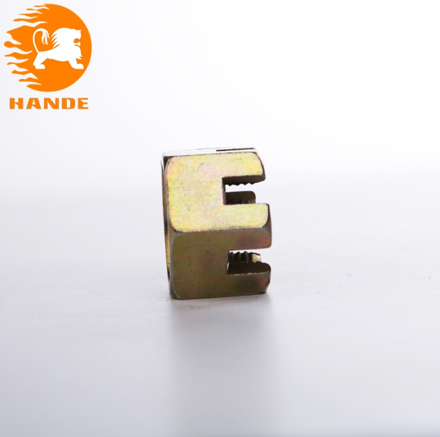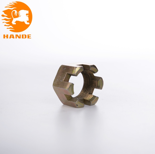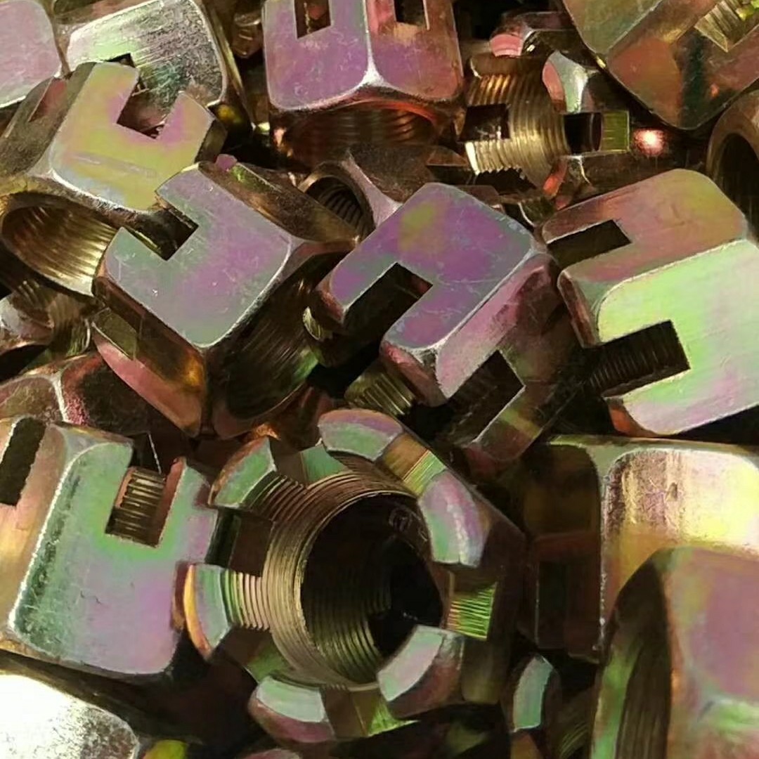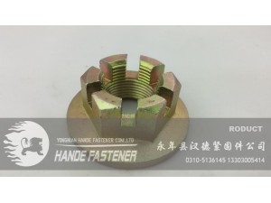 開槽螺母的作用:就是通過緊固穿過前后輪輪軸螺桿固定車輛前后輪軸,使車架和輪胎固定在一起,為了防止螺母松脫,必須用開口銷通過開槽螺母的槽進(jìn)行固定,而開口銷要固定住開槽螺母就必須從輪軸螺桿中間穿過,通常輪軸螺桿兩頭都需要鉆孔,孔的直徑大小和開槽螺母的槽寬和槽深決定了選用什么規(guī)格的開口銷,當(dāng)選用 的輪軸螺桿和開口銷和開槽螺母都比較匹配的時(shí)候,螺母就通過輪軸螺桿固定住前 輪和車架,開口銷通過輪軸螺桿的孔緊固件住了開槽螺母,使開槽螺母不產(chǎn)生松脫, 使車輛在運(yùn)動的時(shí)候也不松脫.